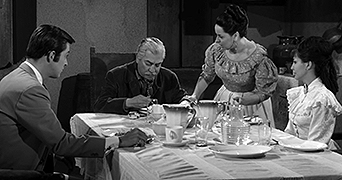Rio Kid (Fernando Luján) gets kicks from roaming around the West, on lookout for brutish gunfighters, eliminating them with his lightning-speed draw. According to legend [and seemingly based on some reality] the bodies of his rivals oddly disappear from their graves soon after burial. The Rio Kid has been active for decades, but during that time, he hasn't aged at all. That's because he's a vampire. His home is a cemetery in San Diego. And Rio's very existence has [somehow] turned San Diego into a decrepit ghost town [not fully explained how or why, but the attempt is made]. As a note: the Rio Kid and his brides have the most amazing vampire fangs in cinema (see top of page, left), looking more like walrus tusks.
